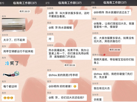 “太冷了,崗亭空調全都運行不起來了。” “每個崗亭都一樣。” “冷死啦!” “修空調的師傅來了,檢查了一下,他說這個沒辦法,是因為天氣太冷的原因,并不是壞了。” “大家衣服趕緊多穿點,誰有舊的工作大衣。” “熱水袋灌起來,不夠,我的拿去先用。” “我也有舊大衣。”