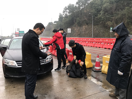 31日是春運(yùn)的前一天,下起了今年的第一場(chǎng)大雪。當(dāng)天10:30分左右,三號(hào)車道如往常一樣正常、有序,該車道正在檢查綠農(nóng)車。這時(shí)一輛牌照為浙JVIT6*黑色小轎車緩緩駛?cè)?,突然該車加速調(diào)整方向,想朝二號(hào)車道沖去。與此同時(shí)從它后方快速?zèng)_出一輛轎車檔在了該車前面,接著后方又沖出一輛黑色轎車,攔截在該車后方的去路。兩輛車上跳下幾個(gè)大漢,以迅雷不及掩耳之勢(shì),一擁而上干脆利落的將車內(nèi)三名犯罪嫌疑人控制。 當(dāng)班收費(fèi)員被這一幕驚呆了,不過(guò)迅速反應(yīng)過(guò)來(lái),啟動(dòng)應(yīng)急預(yù)案,呼叫監(jiān)控員,監(jiān)控員在監(jiān)控視頻中發(fā)現(xiàn)這個(gè)情況后,第一時(shí)間通知所長(zhǎng)。所長(zhǎng)孫明偉得知情況后立即趕赴現(xiàn)場(chǎng),確認(rèn)核實(shí)身份,并令當(dāng)班班長(zhǎng)第一時(shí)間聯(lián)系當(dāng)?shù)嘏沙鏊藢?shí)身份。在得到明確的答復(fù)后,工作人員立刻封閉該車道,為民警辦案提供方便,并打開(kāi)備用車道正常收費(fèi)疏導(dǎo)過(guò)往車輛,組織人員疏散圍觀群眾避免車輛和人員停留過(guò)多影響民警辦案。