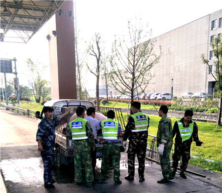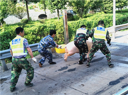 面對突發(fā)的緊急情況,駕駛員一時束手無策,當班副班長立即向值班領(lǐng)導(dǎo)匯報,請求增援。為了防止這頭豬給過往車輛造成安全通行威脅,收費所工作人員及時關(guān)閉了7號車道,此時的“二師兄”不讓人靠近,大家只好形成一個包圍圈,不讓它竄到其他車道去。幾分鐘后,增援的高速執(zhí)勤隊員趕到現(xiàn)場,大家七手八腳,終于將這頭豬扛著,送回到了小貨車上。執(zhí)勤隊員說,這輛車上的一頭豬剛剛還在黃土嶺隧道內(nèi)跳出來一次。