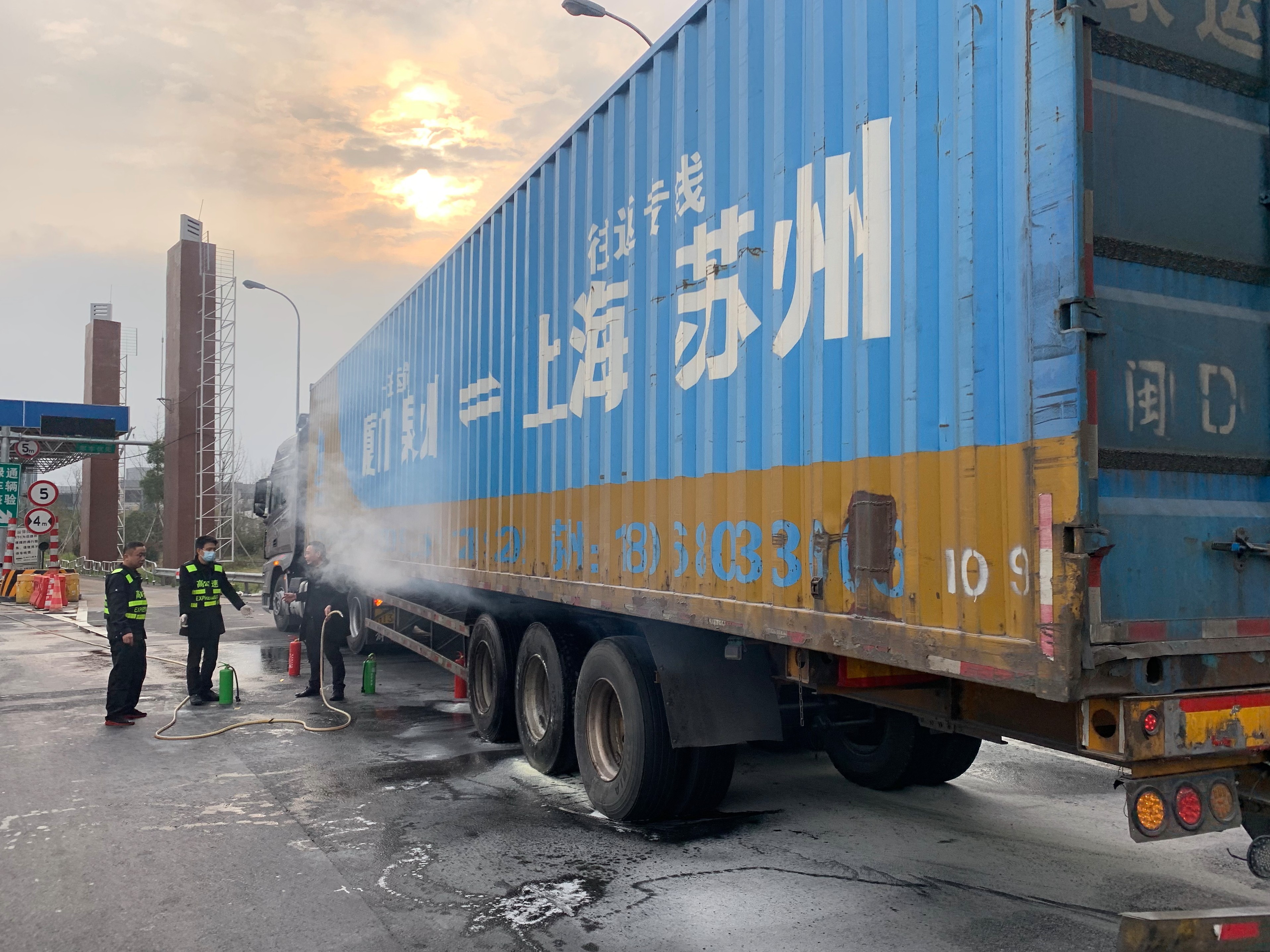 (圖為工作人員奮力救火) 就在這時(shí),突然又一聲巨響, 貨車輪胎發(fā)生二次爆炸,火苗再次復(fù)燃。但大家絲毫不畏懼,提起滅火器對(duì)準(zhǔn)著火點(diǎn),快準(zhǔn)狠,火苗再次被撲滅。現(xiàn)場(chǎng),輪胎處還冒著白煙,監(jiān)控中心何先林提議利用車道上的兩根水管的水對(duì)車輛輪胎進(jìn)行沖水降溫,避免再次發(fā)生爆炸。 經(jīng)過(guò)長(zhǎng)達(dá)半小時(shí)的緊急救援,火勢(shì)終于得到控制,無(wú)人員傷亡,車輛也沒(méi)有造成損失。據(jù)了解,該車起火原因是輪胎上有鐵絲,摩擦產(chǎn)熱導(dǎo)致輪胎爆炸起火。 “太感謝了,全靠你們發(fā)現(xiàn),及時(shí)止損,不然車就燒沒(méi)了。”駕駛員連聲道謝。 在此提醒廣大司乘人員,上高速前務(wù)必要對(duì)車輛進(jìn)行全面檢查,特別是輪胎、剎車等重要部位,避免行車途中發(fā)生故障導(dǎo)致嚴(yán)重后果。 任青青