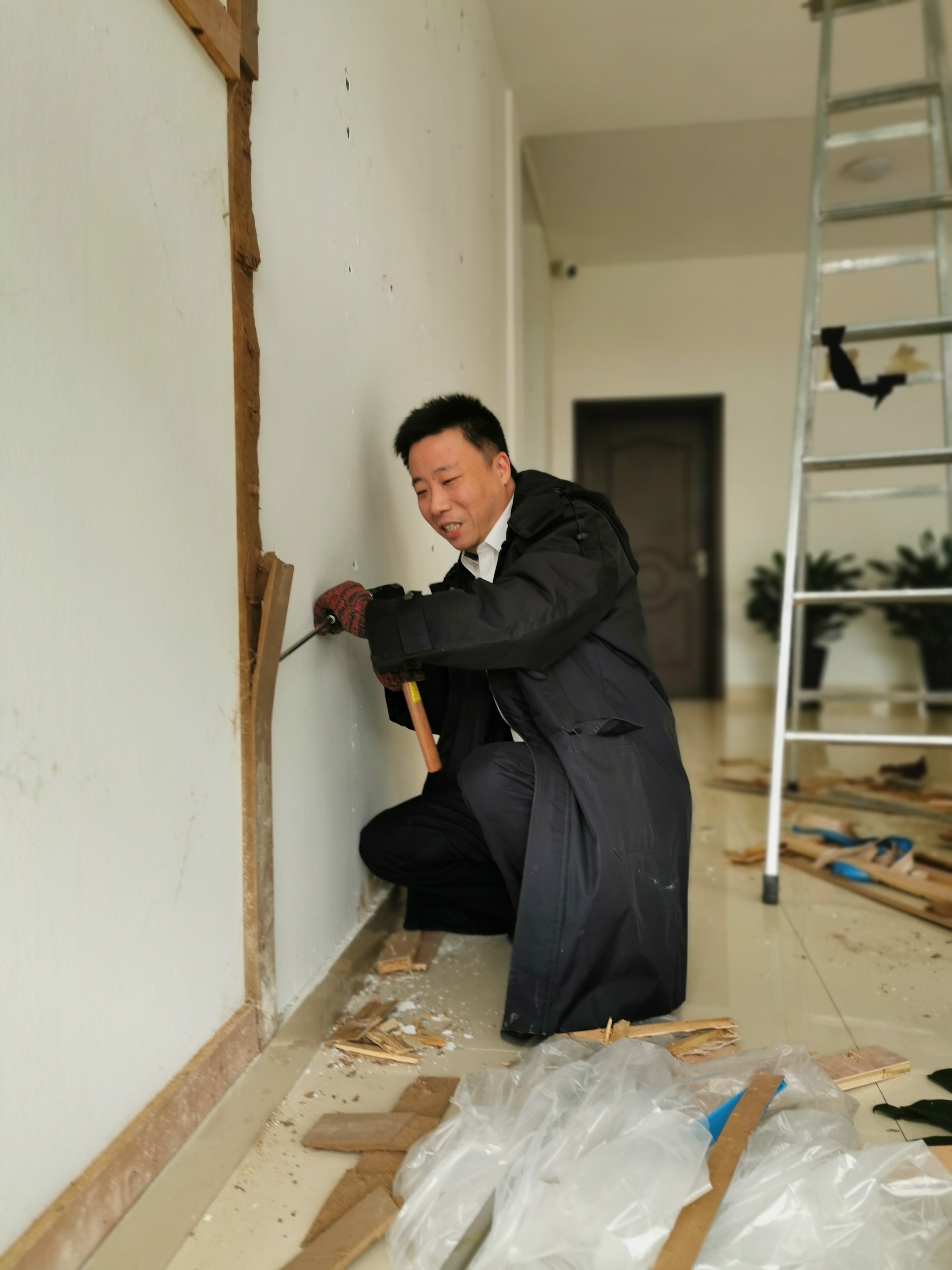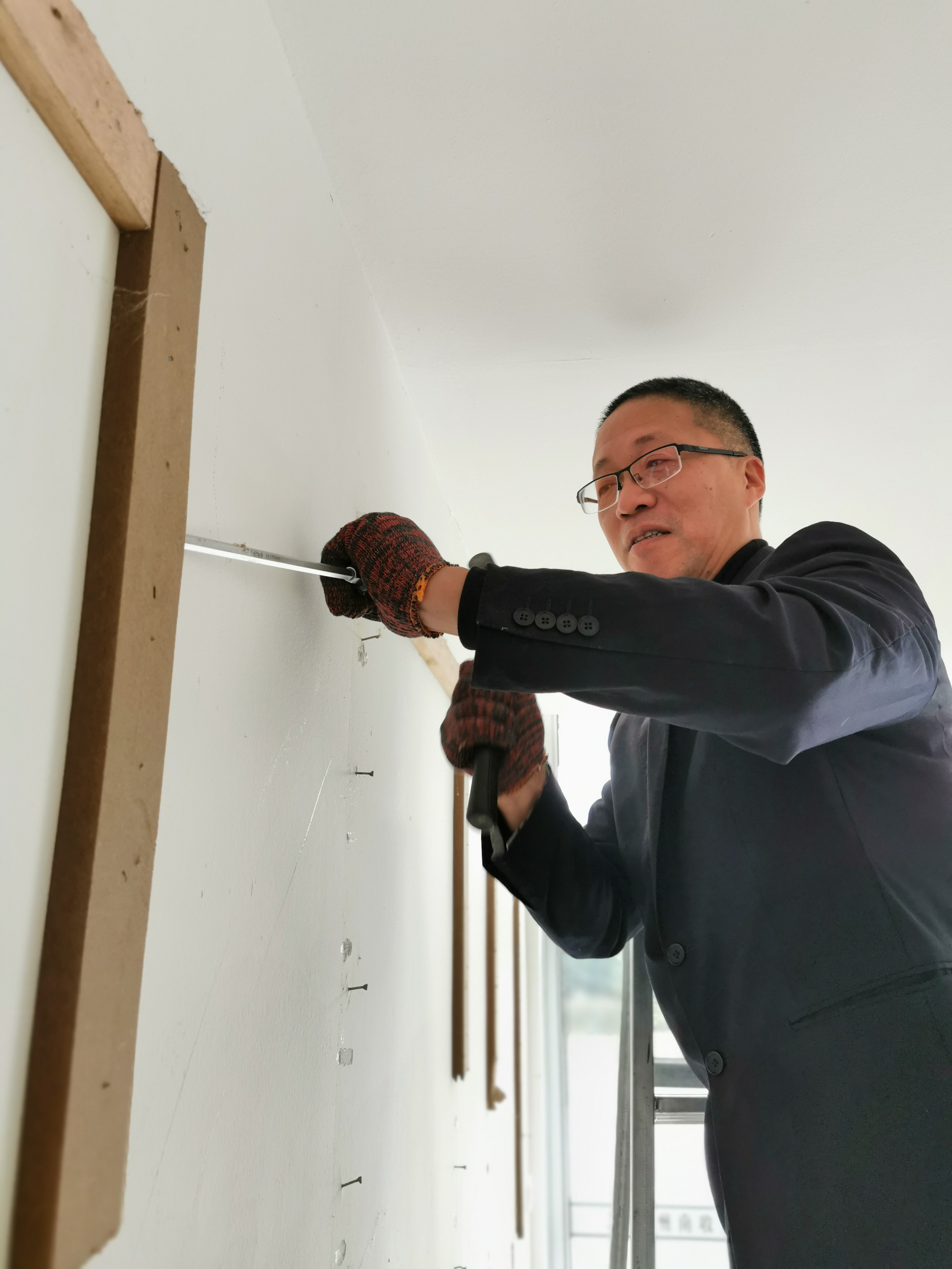圖為杜佳正在拆除舊的黨建介紹版