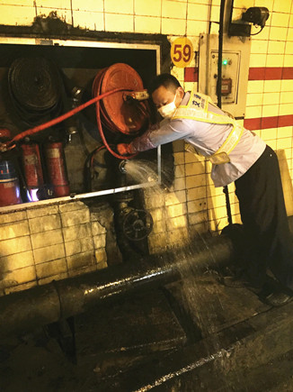 執(zhí)勤隊員們有序分工,紛紛帶上工具,開始檢修消防設備、清洗隧道內攝像頭、維修陳舊的機電設備、拆換燈具等等,現場一派忙碌的景象。四公里長的隧道內有82個消防箱,每隔50米就有一個,而里面空氣質量很差,比霧霾嚴重數百倍,僅一只口罩根本凈化不了廢氣,但由于時間緊,任務重,隊員們顧不上惡劣的環(huán)境,努力和時間賽跑,爭取高效完成任務。