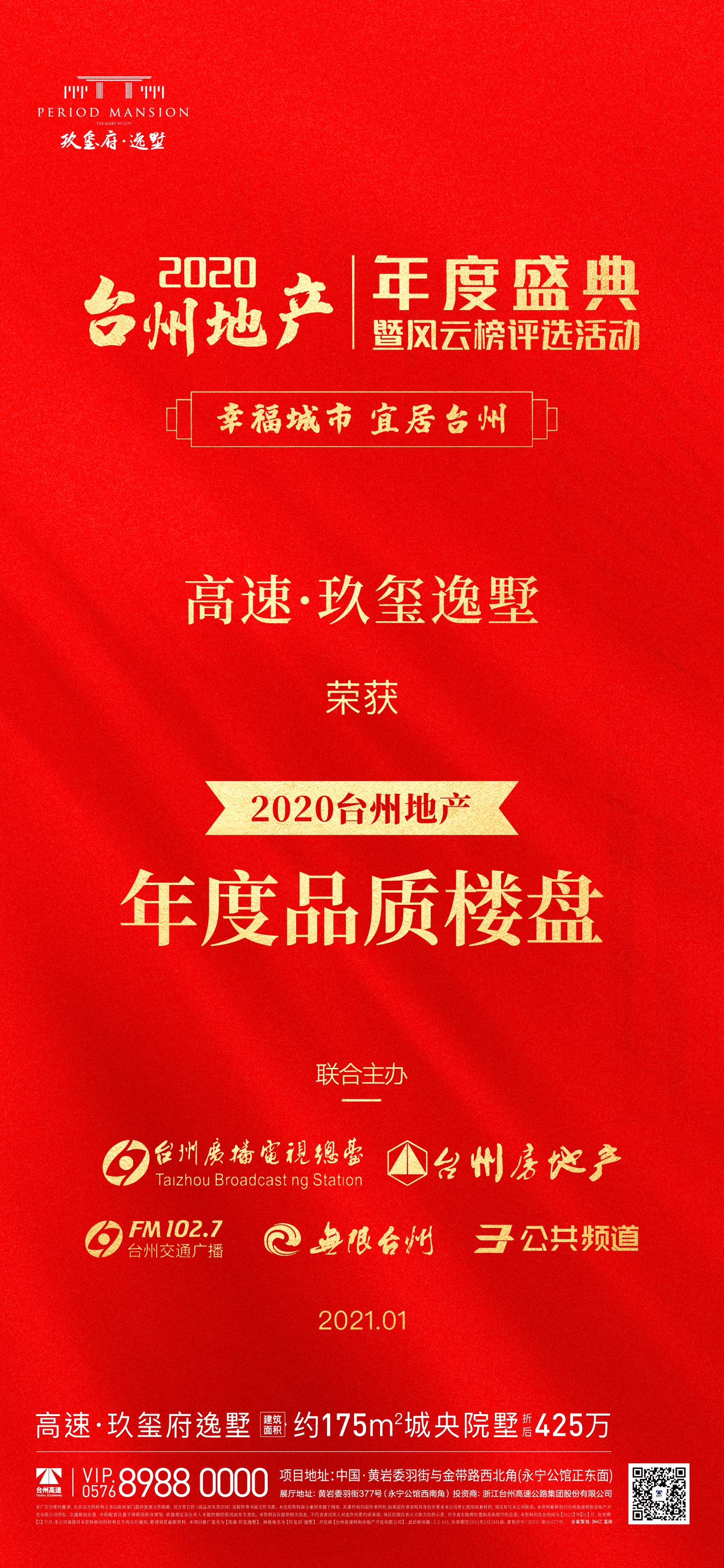 2021年1月19日下午,由臺州廣播電影電視集團聯合臺州市房地產業協會共同舉辦的2020臺州地產年度盛典暨臺州地產風云榜,在全城熱矚下重磅舉行。高速房產玖璽府·逸墅項目榮獲“2020臺州地產年度品質樓盤”榮譽稱號。