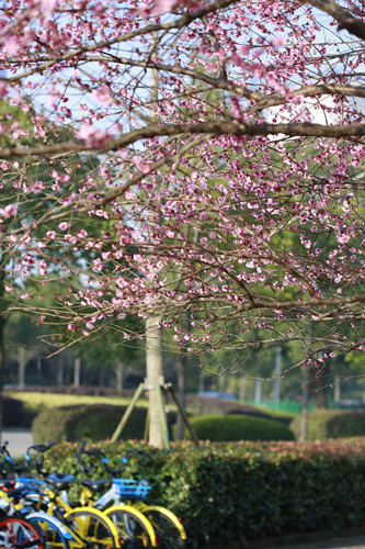 最后一站,便是市民廣場(chǎng),我見過的最美公交站臺(tái)。初春的清晨啊,一下車便有沁香拂散,迎接我下車的那是大片繁花盛開呀,路邊草地一溜的紅梅、白梅,在藍(lán)天下絢爛地肆無忌憚地綻放。呵,是的,還有藍(lán)天,最近流行的一個(gè)詞叫“臺(tái)州藍(lán)”,忽然想起來,每日公交車上下班,低碳出行,這算是我為“臺(tái)州藍(lán)”添了一筆淡藍(lán)嗎?應(yīng)該是吧。于是,在藍(lán)天紅白花海中,慢慢穿過梅林、小橋、亭子,上班之路竟是如此心情舒緩。 鄭蔚