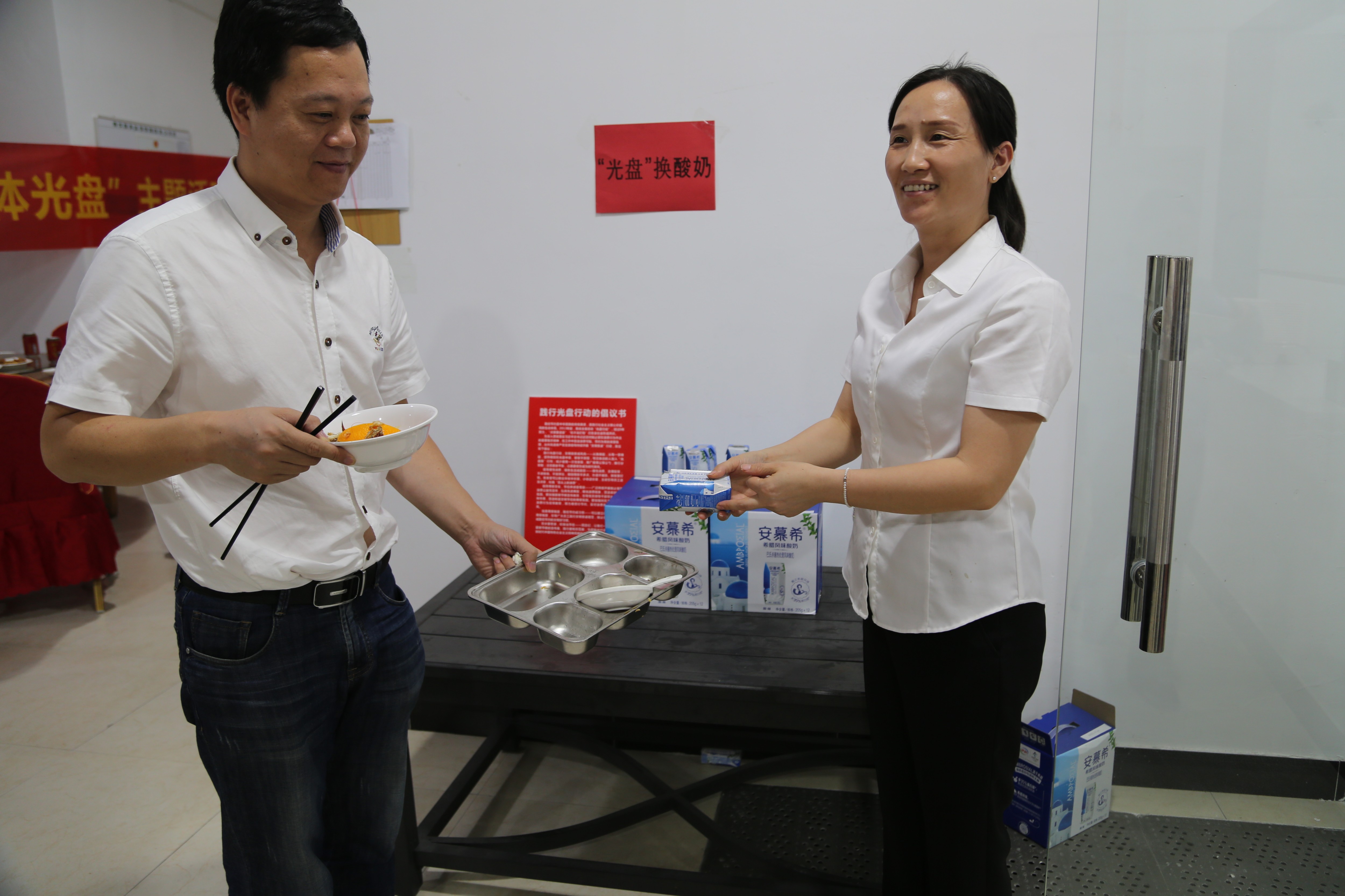 餐后,公司為倡導(dǎo)員工愛惜糧食,鼓勵員工積極光盤,實行“光盤獎勵”,每一位員工憑光盤可以兌換酸奶一瓶,借此小獎勵,倡導(dǎo)文明新風尚,以“光盤”為榮,以“剩宴”為恥。 盧丹麗