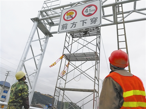 圖為工人在為內(nèi)環(huán)路安裝標(biāo)志牌。趙鵬攝